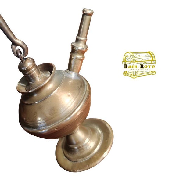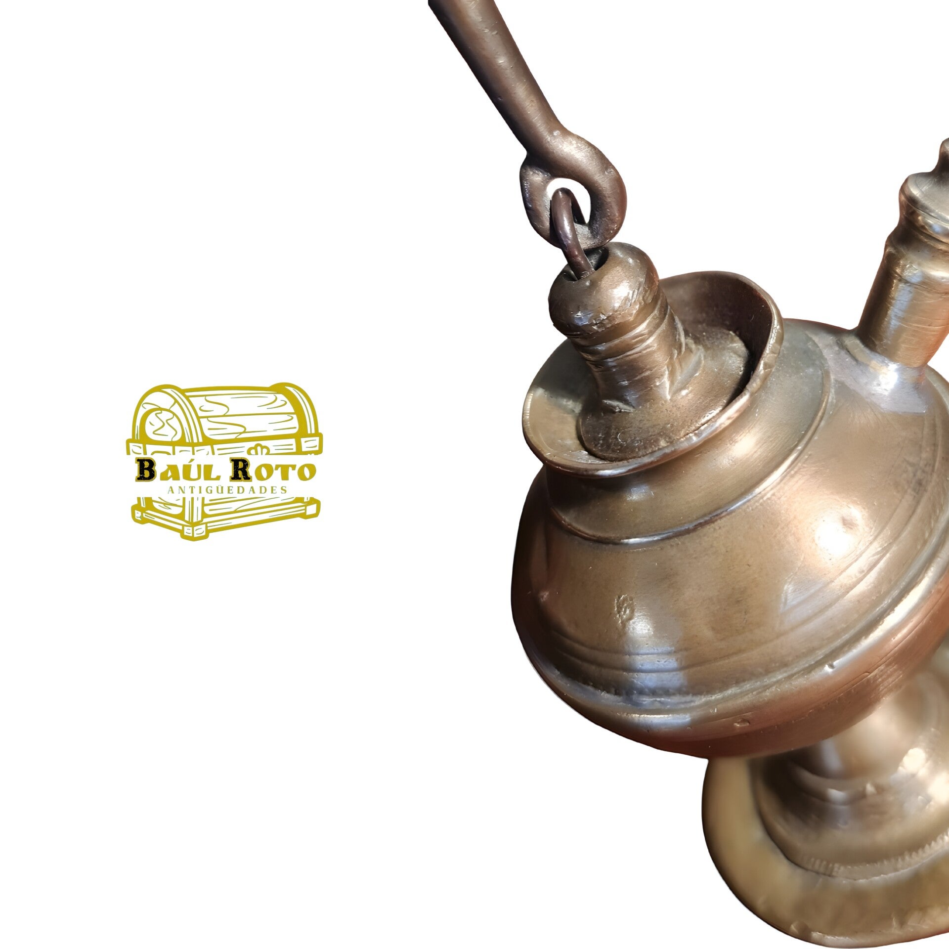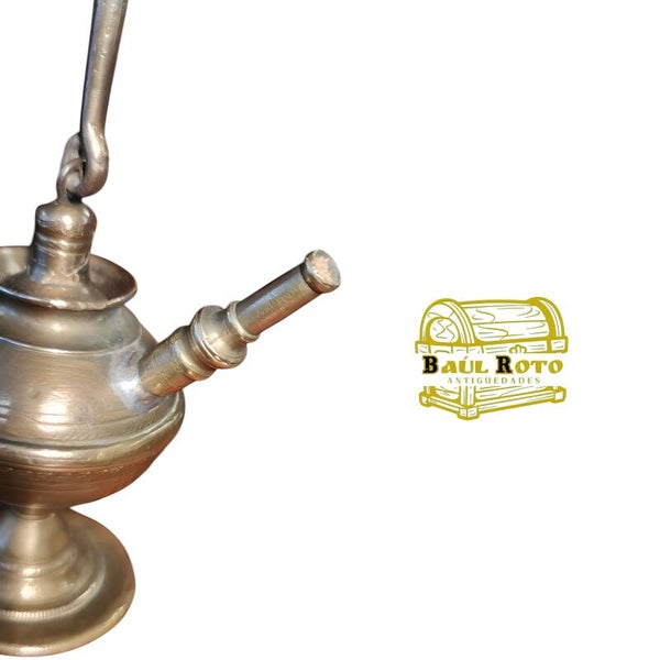 Este candil de aceite o petróleo es una pieza antigua y única, probablemente fabricada en la primera mitad del siglo XX. Hecho de bronce o latón, mide 20 cm en total, incluyendo el cuelgue, y el propio candil tiene unas dimensiones de 11 cm de largo por 6 cm de ancho. Este tipo de candiles eran comunes en los hogares y establecimientos de la época, ya que proporcionaban una fuente de luz fiable y duradera.