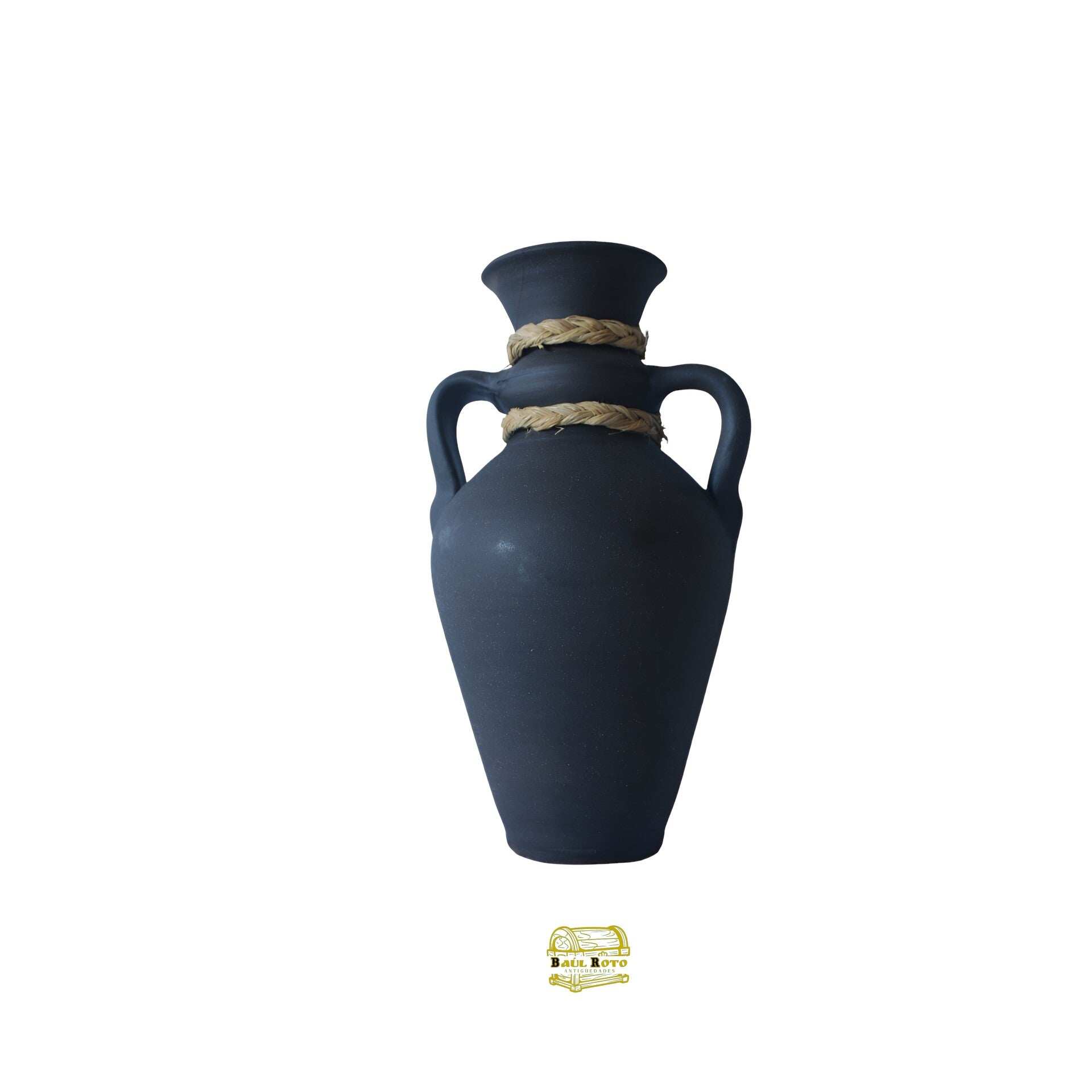 Jarrón muy original de cerámica con asas a ambos lados y cuerda trenzada en la zona del cuello.