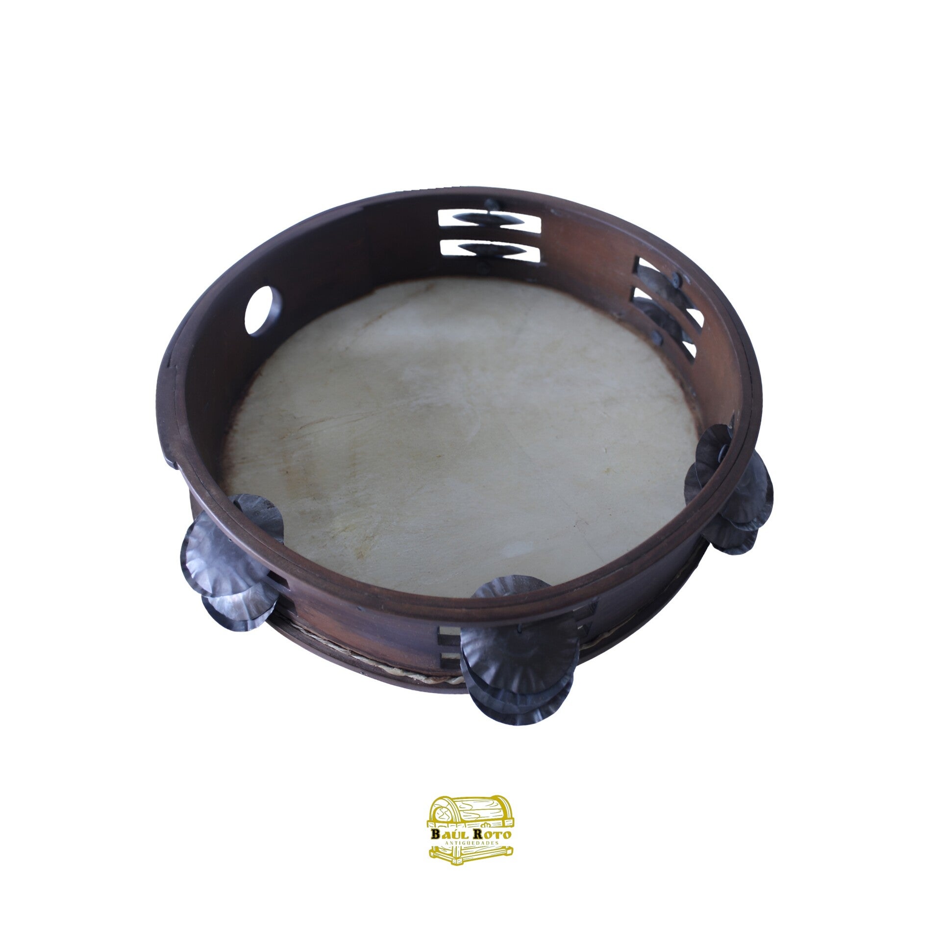 Antigua pandereta castellana de madera de castaño y piel de ovino y sonajas de metal.