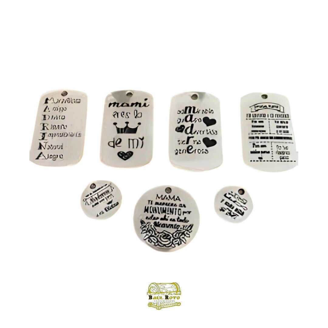 - Material: Los llaveros y colgantes parecen estar hechos de un material claro, posiblemente metal o plástico, que permite que el grabado láser resalte.