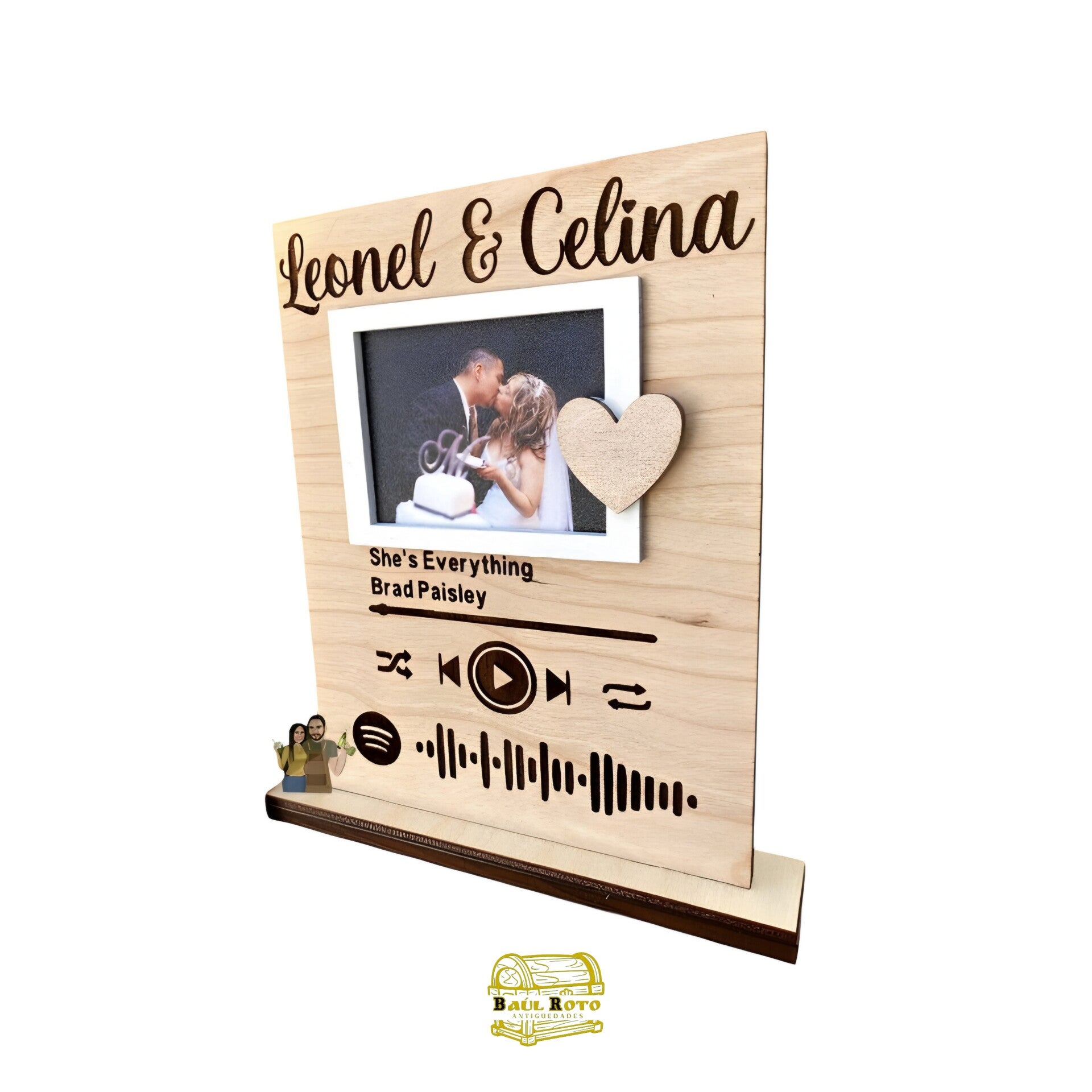 - Personalización Total: Graba una foto especial en la placa de metacrilato y añade un nombre o mensaje en la base de madera.