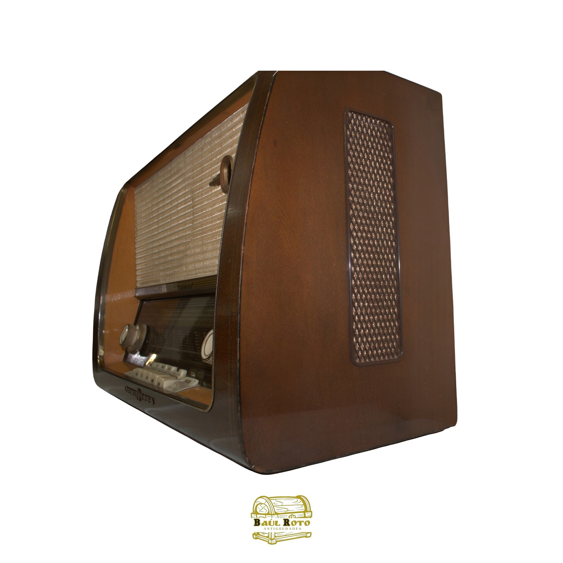 Fabricada en Alemania en 1953. Esta radio está en magnífico estado de conservación y funciona perfectamente. Tiene un doble amplificador con dos válvulas EL84 y una excelente calidad de sonido.