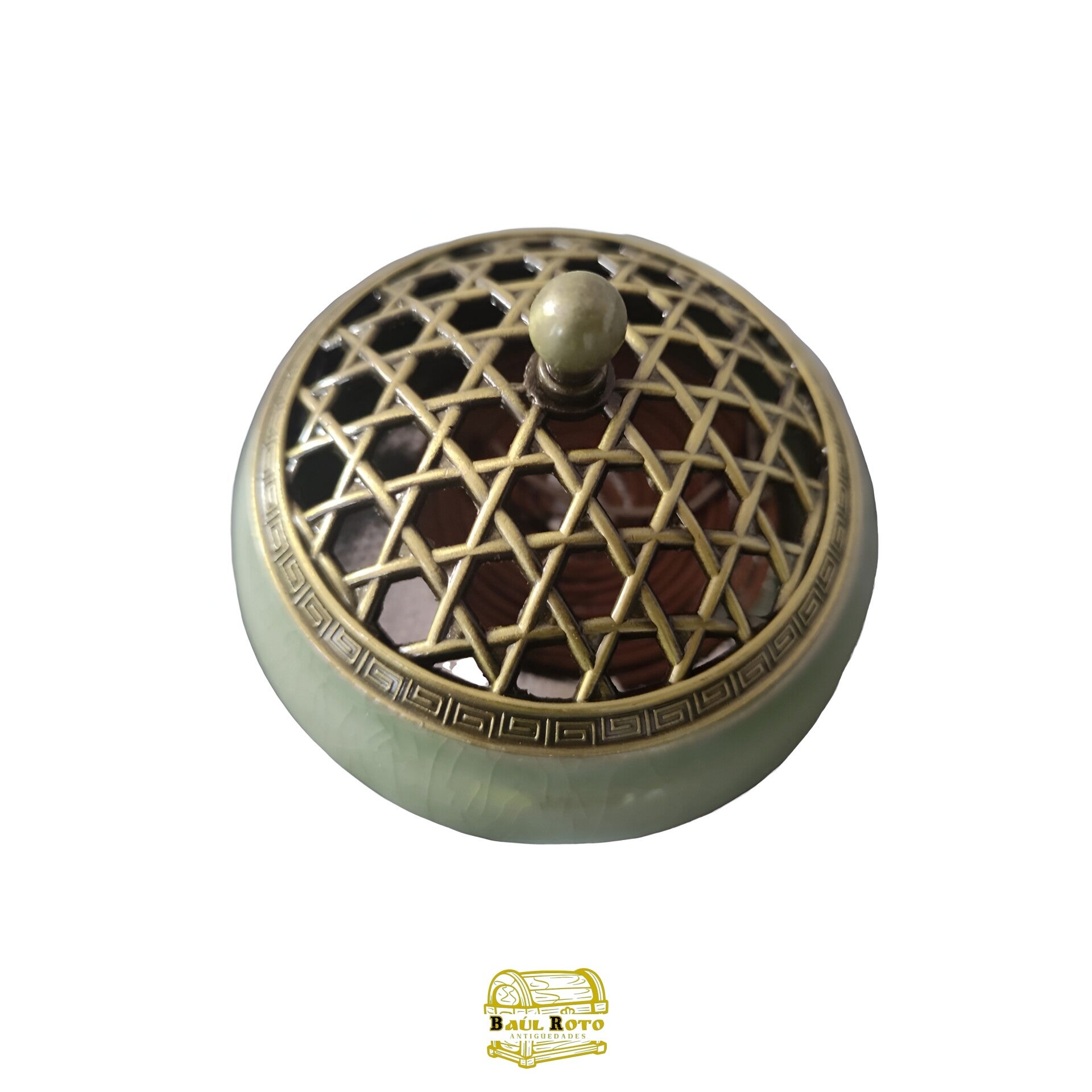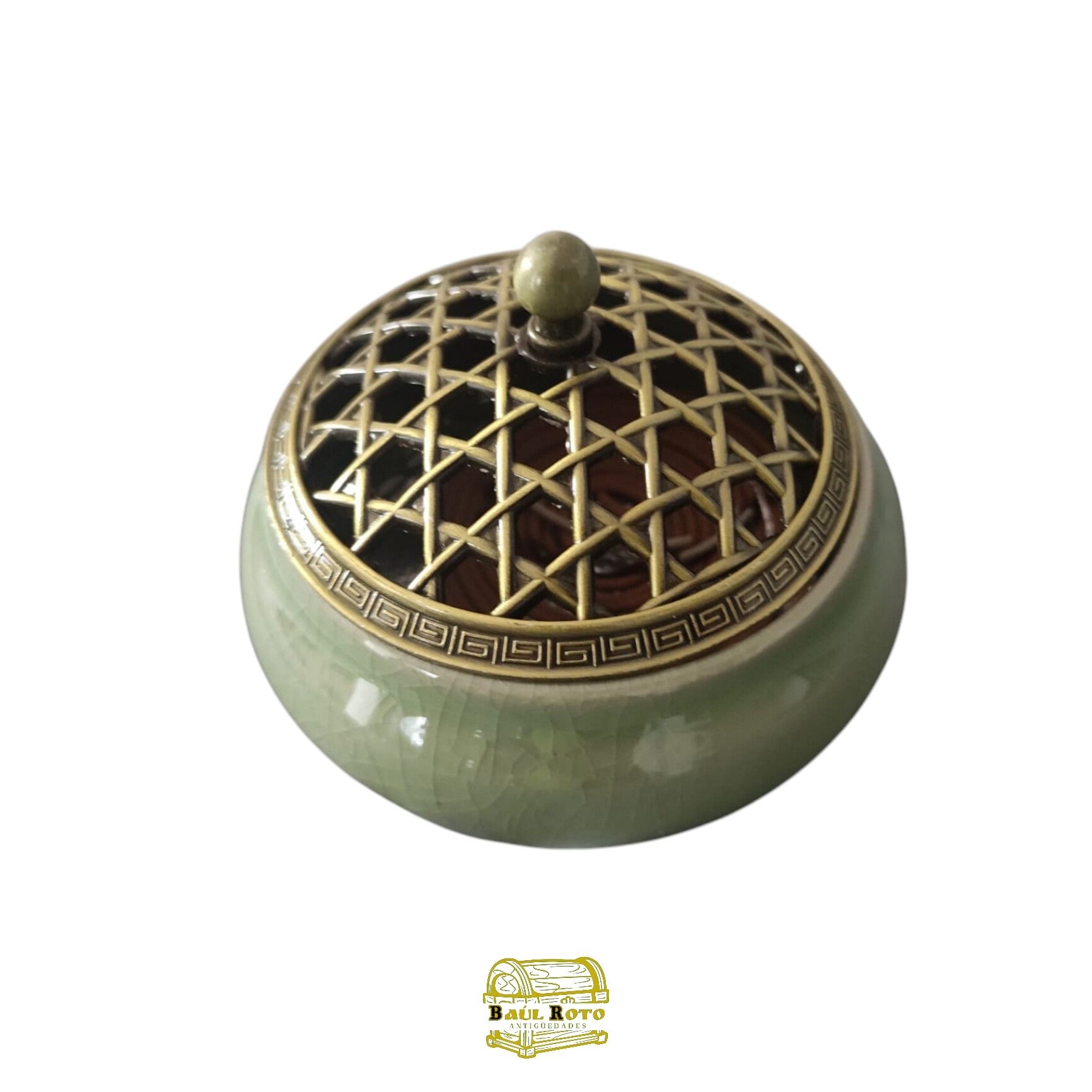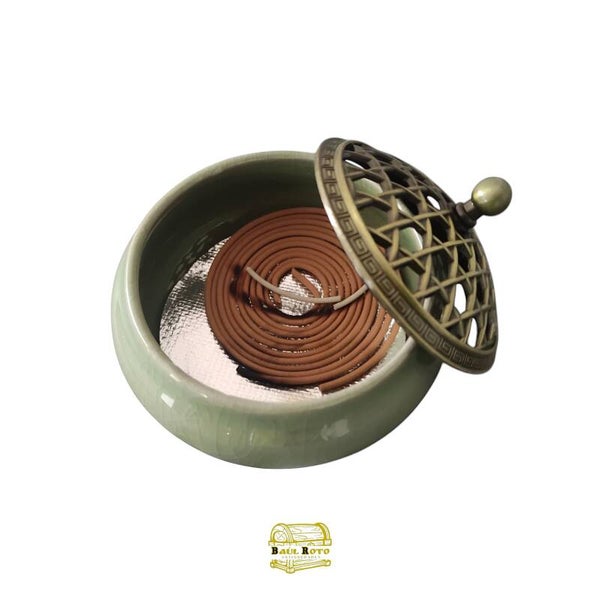 Elegante quemador de incienso de céramica con tapa de metal, ideal para áromaterapia en yoga, meditación y spa. Perfecto para palitos de sándalo, conos y bobinas.
