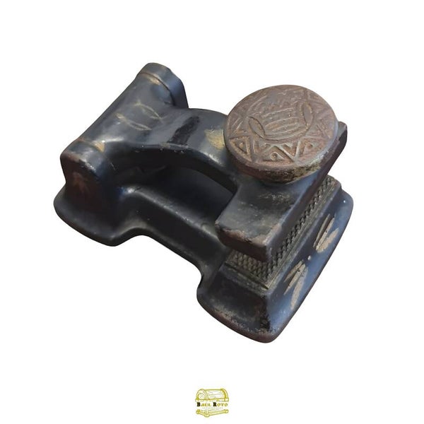 Esta histórica prensa para sellos, originaria del área de Kansas City y fabricada alrededor de 1900, fue diseñada para proteger cheques y firmas contra falsificaciones. Al estampar, crea un patrón intrincado que dificulta la alteración de la firma o la escritura.