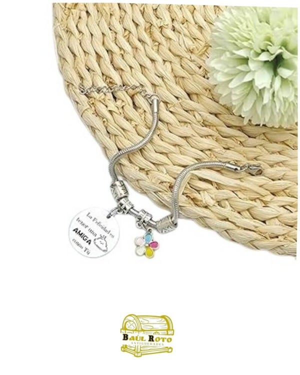 Celebra la amistad con esta pulsera única y significativa. Fabricada en acero inoxidable de alta calidad. Esta pulsera presenta un diseño encantador con colgantes y un mensaje grabado que captura la esencia de la amistad. Un regalo perfecto para Cumpleaños, Aniversarios o simplemente para expresar tu aprecio a una Amiga Especial.