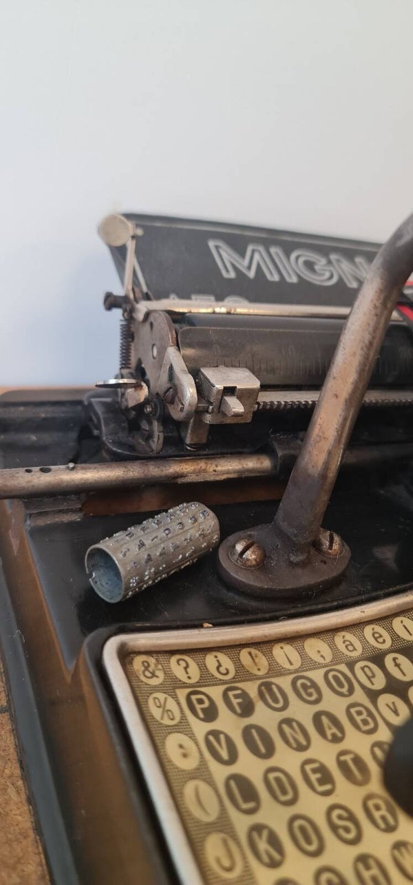 La máquina de escribir Mignon AEG Modelo 3 USG. Representante icónica de la ingeniería alemana de principios del siglo XX, este modelo es altamente valorado por su innovador diseño de índice y puntero, que prescinde del teclado tradicional, ofreciendo una experiencia de escritura única y distintiva.